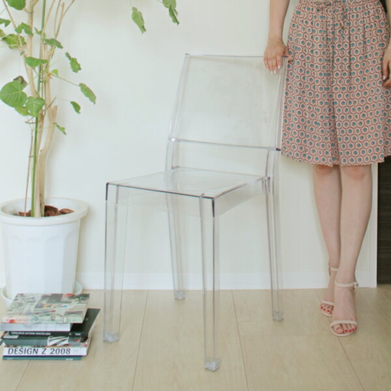 透明感が涼しげな空間を広く見せてくれるスタッキングチェア。一般住宅から結婚式場、カフェ、など様々なシーンで大人気の商品です。
