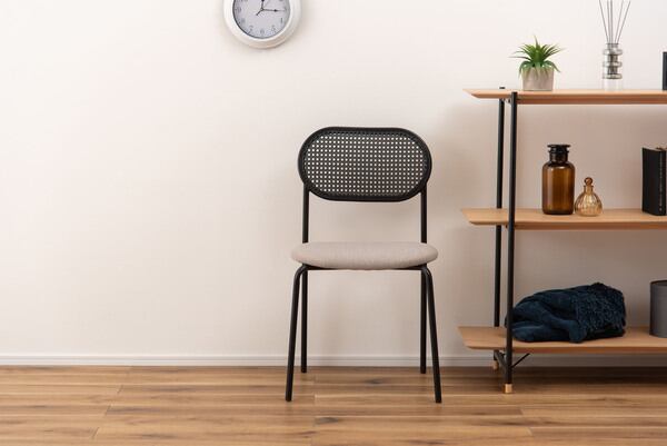 ポリエチレン素材のラタン調デザインを施した背面と、ファブリック素材の座面の組み合わせが新しく、あたたかみがありながらもスタイリッシュなスチールの細脚でぐっと引き締まった印象も与えてくれるチェアです。