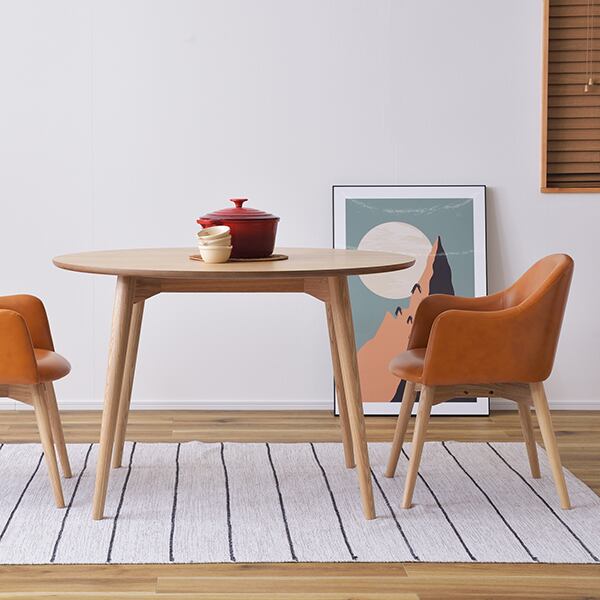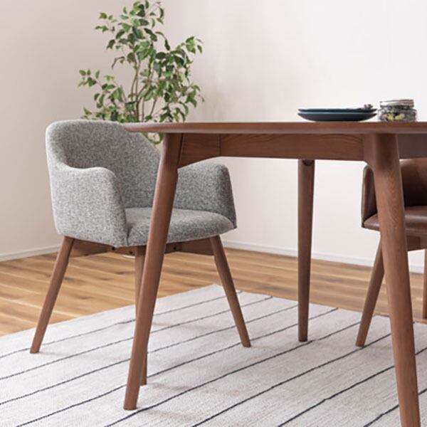 シンプルなのに、どこかやさしさを感じさせるシリーズ。落ちついた色・丸みのあるデザインを取り入れ、永く親しみやすいように仕上げました。脚部は角を落とし、ハの字に設計することで、優しい印象に。背もたれとアームが一体になったチェアは、曲線を意識したデザインでかわいらしく優しく仕上げています。背もたれとアームが一体になった身体をしっかり支えるダイニングチェア。長時間座っていても疲れにくく、ダイニングでゆったりとした時間を過ごすことができます。